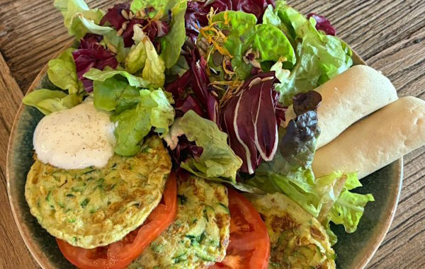 Kou Kou (Kartoffelpuffer mit Zucchini) Blattsalat und Ciabatta Stick