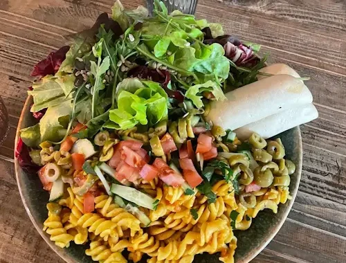 Bunter Nudelsalat mit Blattsalat und Ciabatta Sticks
