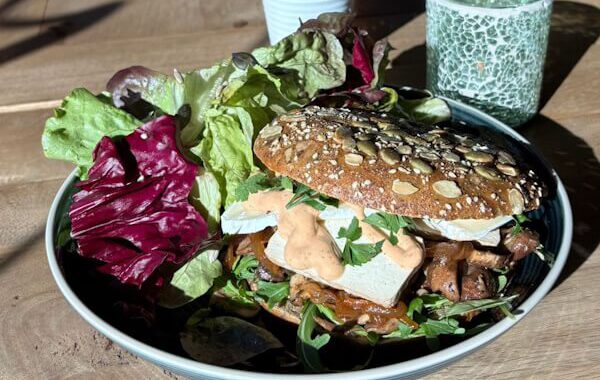 Pilze, Rucola, Camembert, Räuchertofu, confierte Zwiebeln, Soße