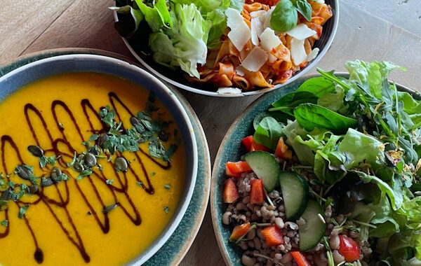 Rotkohlsuppe mit Apfel, Schmand, Dill und Croutons