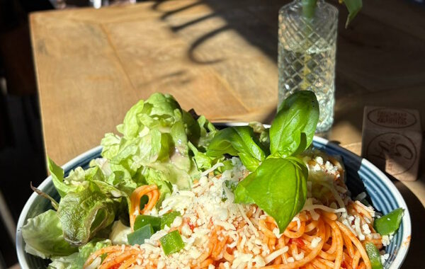 Bandnudeln mit Paprika-Tomatensoße, Parmesan und Blattsalat