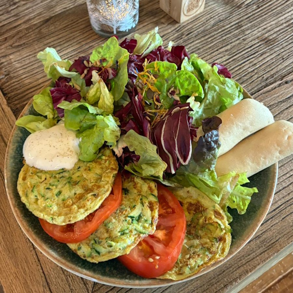 Kou Kou (Kartoffelpuffer mit Zucchini) Blattsalat und Ciabatta Stick