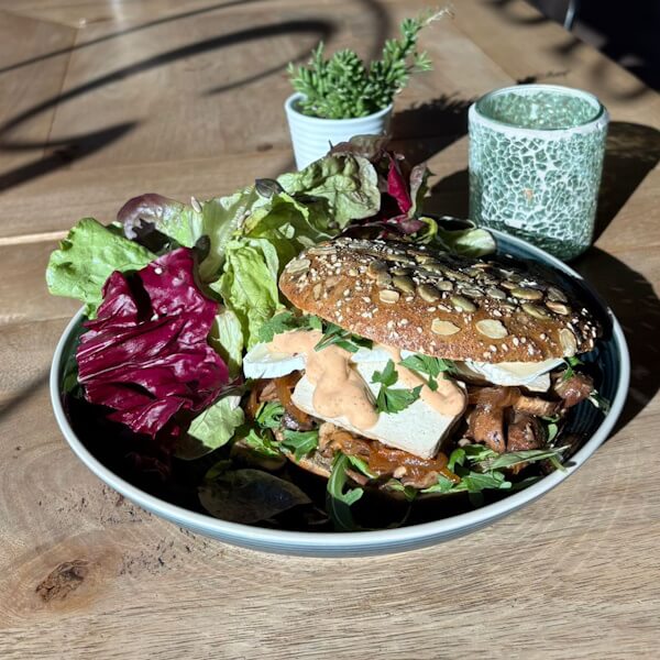Pilze, Rucola, Camembert, Räuchertofu, confierte Zwiebeln, Soße